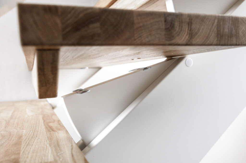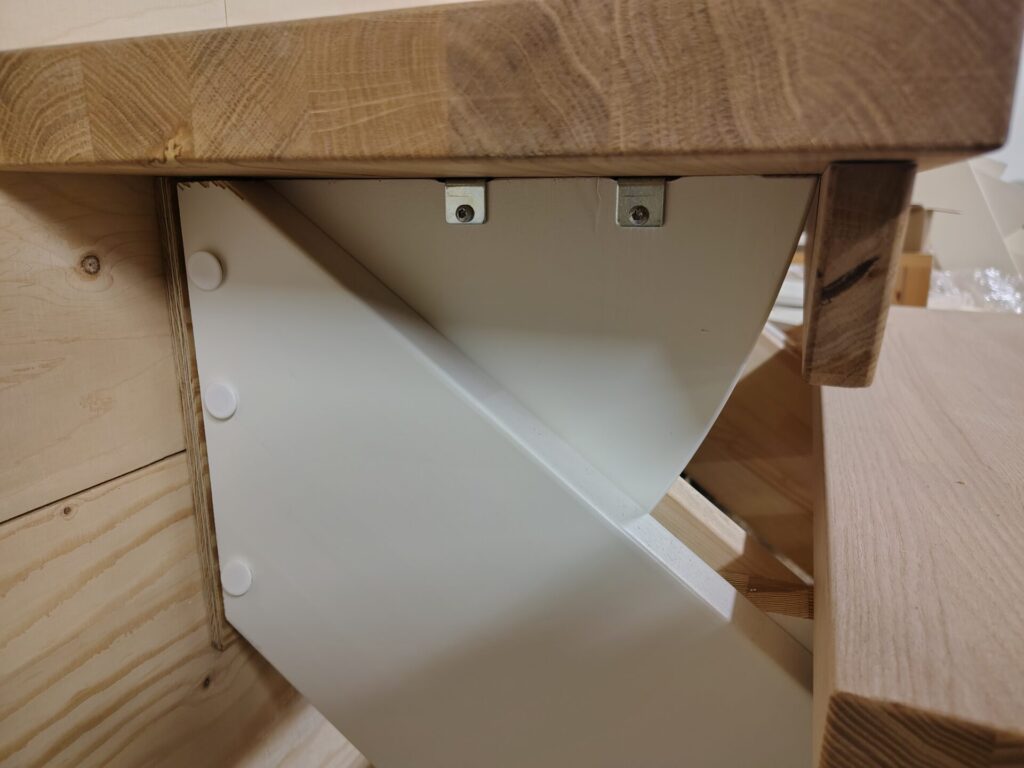 – Uppe kapas trappan i två skär för att skapa en ”hylla” som kan hängas upp på väggfästet.