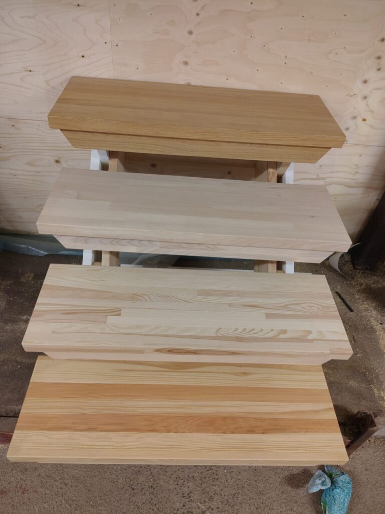För att även leverera en komplett trappa med steg och räcken tillkommer dessa delar. Flexitrappan har tidigare levererats med både ek och furusteg med barnsäkerhetslist och sättsteg.